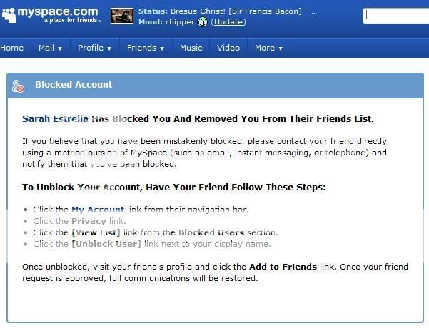 You know you've made it when you get blocked on Gheyspace by a wannabe naked internet 'pinup':